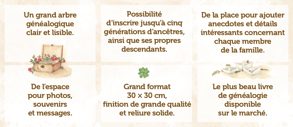 L’arbre de notre famille est un livre original permettant de documenter l’arbre généalogique et l’histoire d’une famille. Ce livre très astucieusement conçu permet de répertorier vos ancêtres en remontant jusqu’à cinq générations, mais également tous vos descendants. Il permet d’inclure des informations intéressantes sur chaque membre de la famille et sur sa vie ainsi que leurs photographies. Il vous offre également la possibilité de demander à certains membres de votre famille d’écrire un message pour vous et vos descendants comme dans un livre d’or.