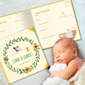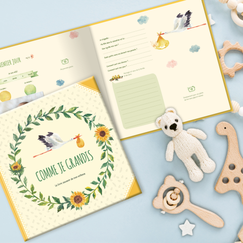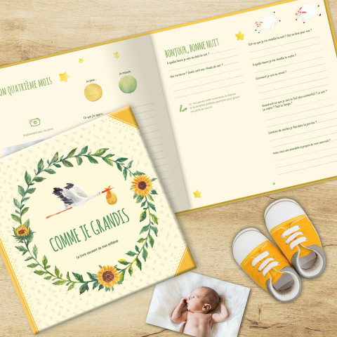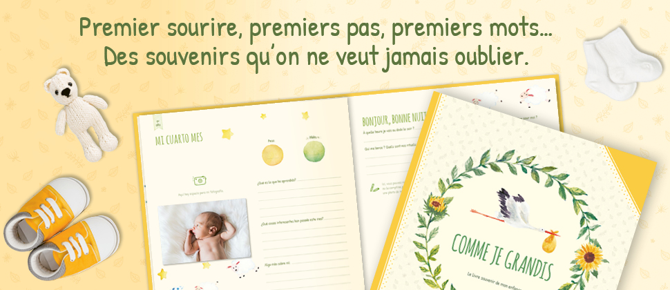 Au début, ce sont les parents qui rempliront les pages du livre « Comme je grandis ». Plus tard, l’enfant pourra participer avec ses dessins, son écriture ou des photos. Des emplacements sont aussi réservés pour les messages des membres de la famille et des amis.